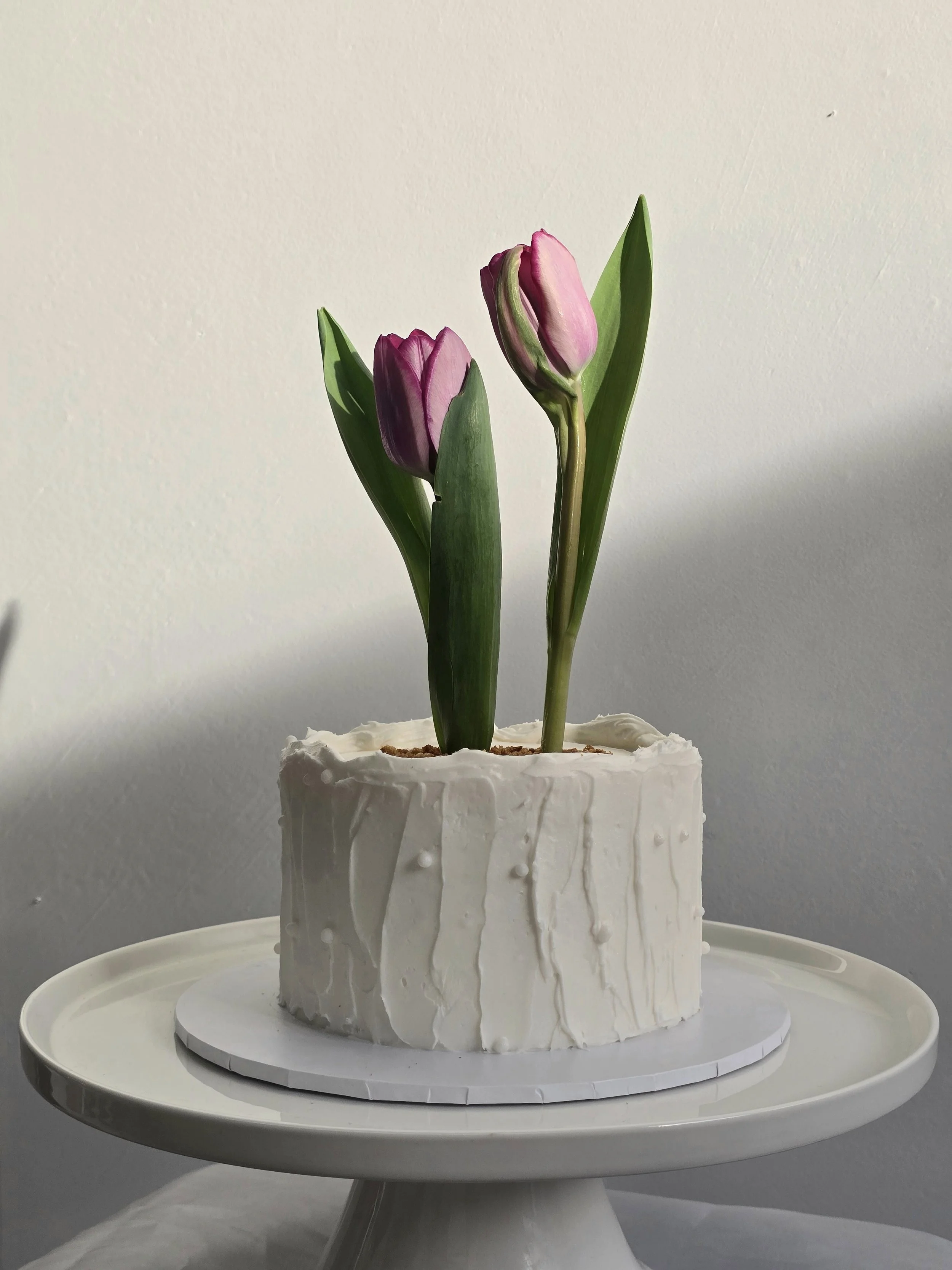 Each cake is finished with a textured flower pot design and two tulip stems sourced from our local florist, Rose Studios (@rosestudios_)